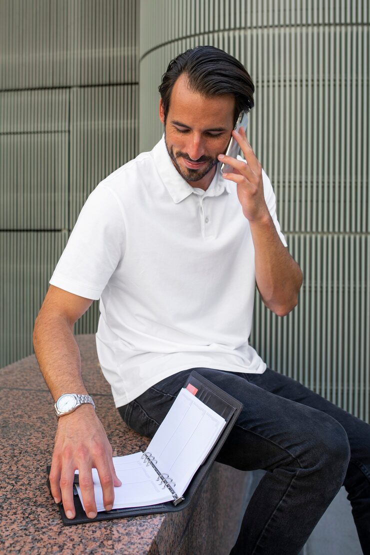 Перед. Связать поло как спинку, но для горловины через 34 см (106 рядов) от нижней планки следует отметить середину вязания. Для левой половины переда провязать петли, не доходя четырех петель до середины работы, и отложить. Затем для правой (при ношении) половины переда выполнять следующее: выполнить кромочную петлю, две лицевые петли, две изнаночные петли, две лицевые петли (что составляет 7 петель планки застежки поло), после чего продолжить работу согласно узору. Петли планки в изнаночных рядах провязывать по рисунку. Далее узор №3 распределять от края горловины (после планки).
