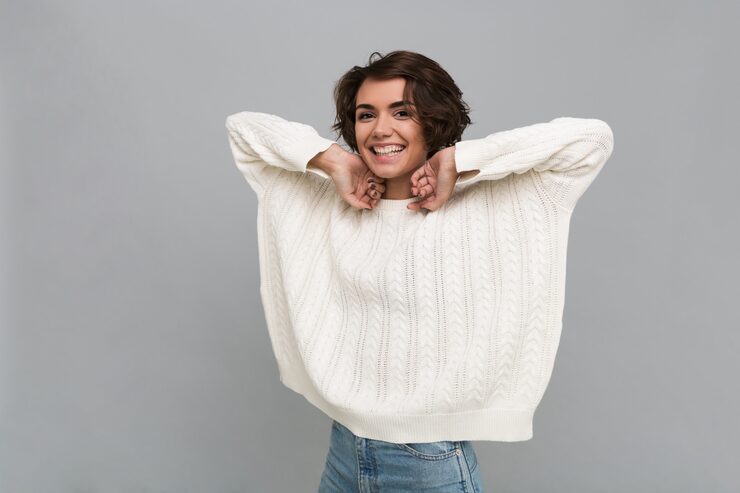 Использование белоснежной пряжи из натуральной шерсти и простой лицевой вязки делает этот пуловер универсальным дополнением к любому гардеробу. Особое внимание привлекают мотивы из «кос», расположенные по центру и обрамляющие V-образный вырез, что позволяет подчеркнуть линию шеи и зону декольте.