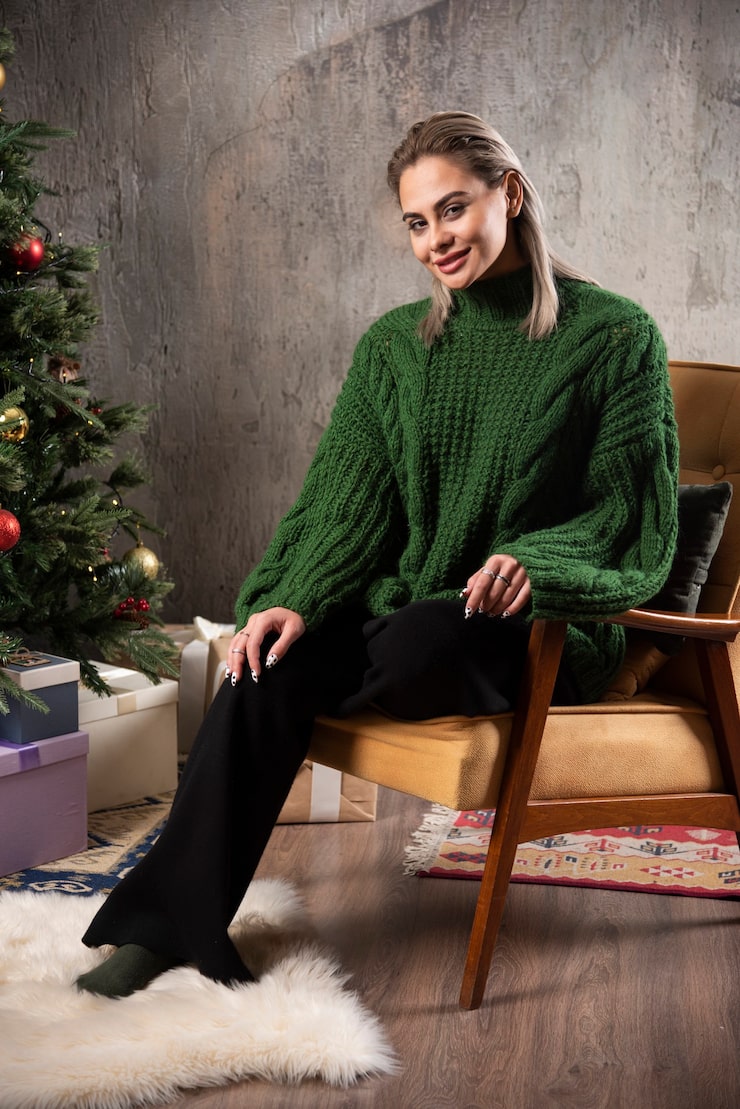 Тёплый пуловер цвета карри с оригинальным узором из кос и ромбов
