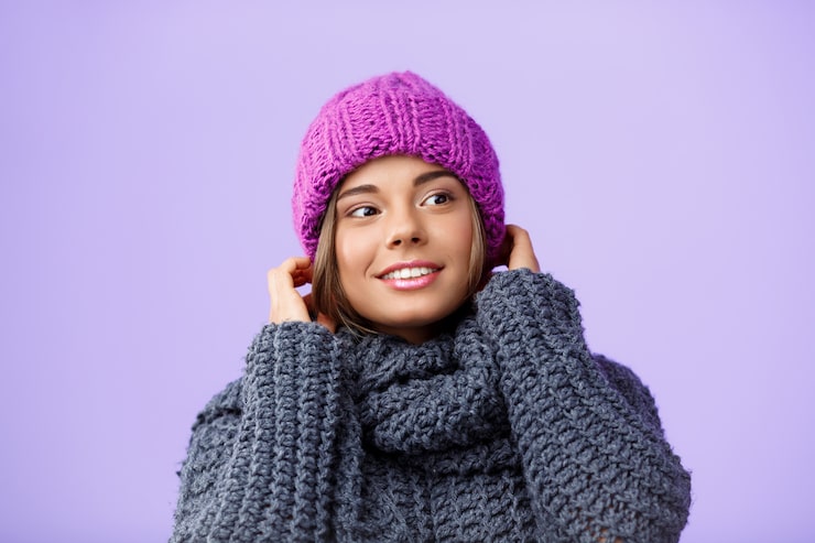 Яркий пуловер с ромбами и шапка насыщенного розового оттенка