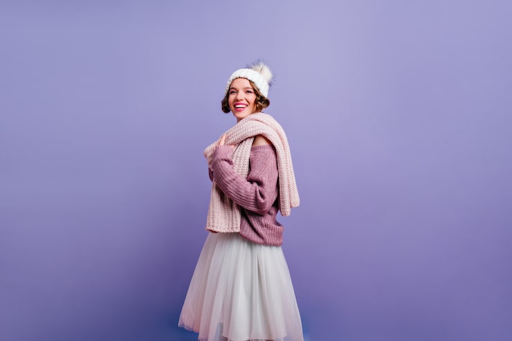 Вам потребуется: пряжа (60% овечьей шерсти, 20% шерсти альпака, 20% шелка; 150 м/50 г) — для пуловера 300 г и для юбки 200 г фиолетовой; спицы № 3,5; 1 комплект чулочных спиц № 3,5.