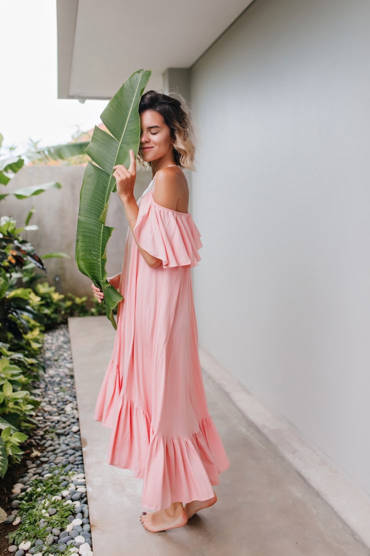 Элегантный топ с длинными бретелями и А-силуэтом выполнен из хлопка цвета лосося.