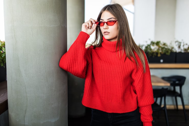 Этот стильный красный пуловер приталенного кроя с большим воротником выполнен спицами из мягкой пряжи с добавлением шерсти альпаки, используя разнообразные структурные узоры.