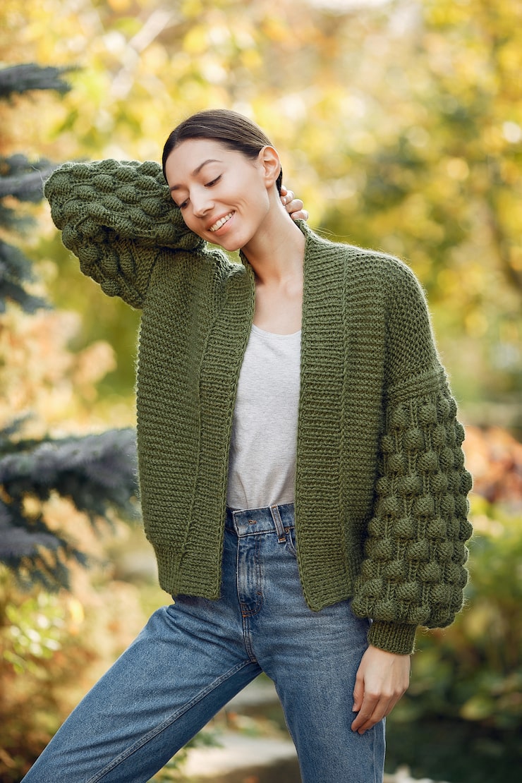 Вам потребуется: пряжа (100% биохлопка; 90 м/50 г) — 500 (600) г желто-оранжевой; спицы № 4,5 и 5,5; круговые спицы № 4,5; 5 пуговиц диаметром 18 мм.