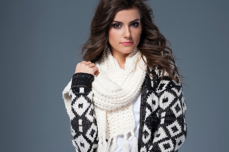 Теплый и уютный палантин из мягкой шерсти с шерстью альпака связан простым узором из лицевых и изнаночных петель и украшен кисточками по краям.