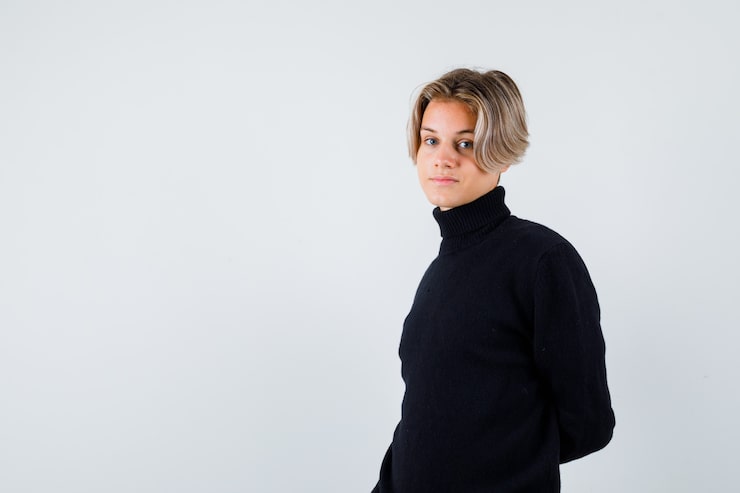 Сборка. Пришить плечевые швы. Для воротника гольф двойной нитью (используя по одной нити каждого вида пряжи) на круговые спицы по краю горловины набрать 96 петель и провязать 20 см узором 1. Закрыть петли согласно рисунку. Вшить рукава. Сшить рукава и боковые швы.