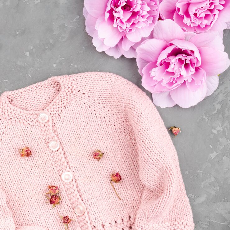 Вам потребуется: пряжа (100% шерсти; 80 м/50 г) — 600 (600) 650 г розовой; спицы № 5,5 и 6,5; круговые спицы № 5,5; 7 пуговиц диаметром 23 мм.