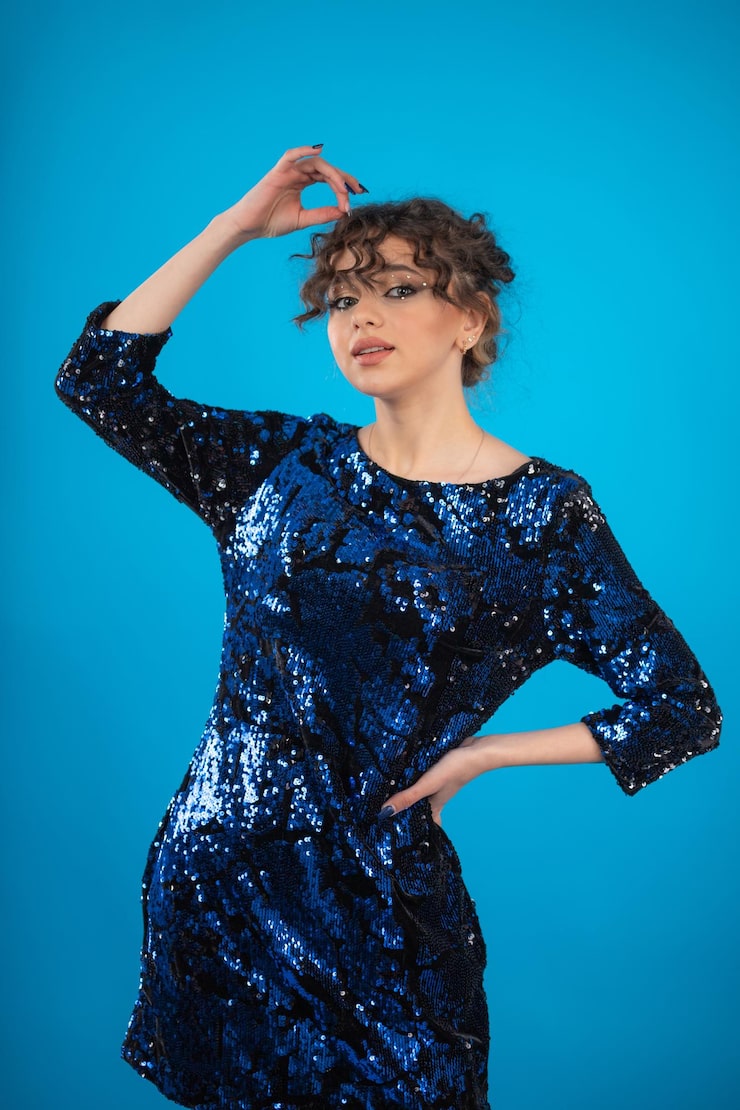 Платье, выполненное в технике вязания с эффектом запаха, имеет юбку, связанную вертикально снизу вверх, и лиф, выполненный горизонтально от рукава до рукава. Оно связано из дырчатого узора, сочетающего вискозу и лен, и окрашено в синий цвет.