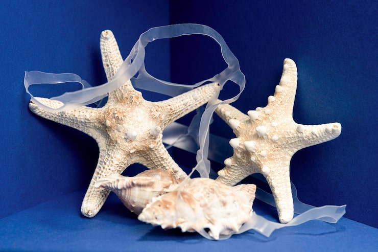 Морская звезда (один элемент из кремово-белой нити и три элемента из нити цвета шалфея): вязать согласно схеме круговыми рядами, при этом 1-й круг. р. выполнить вокруг нитяного кольца. Выполнить 1 раз 1-4-й круг. р.