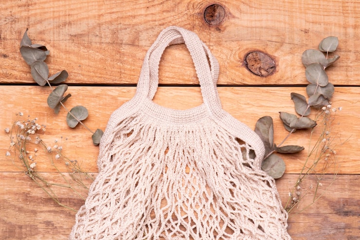 Яркая вязаная крючком сетчатая сумка-мешок привлекает внимание своим насыщенным красным цветом.