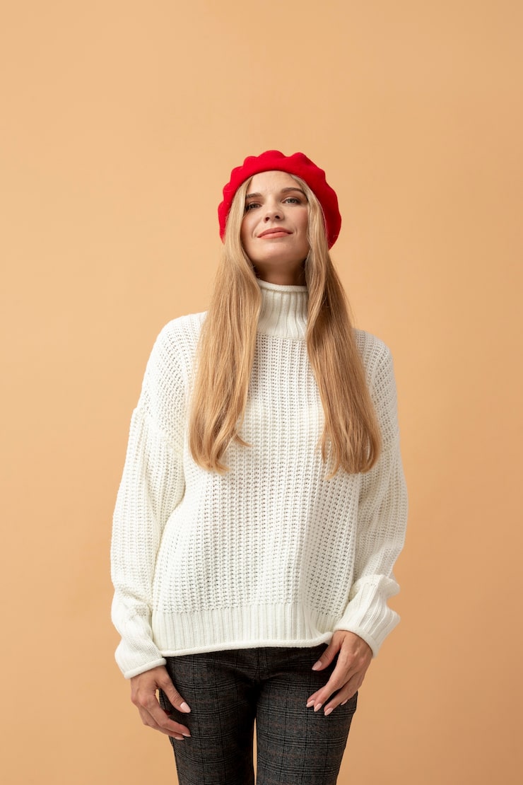 Этот просторный вязаный пуловер с рукавами до локтя привлекает внимание не только прекрасным цветом, напоминающим омара, но и изысканным сочетанием узоров, таких как пузырьки, решетка и «косы». Кромка горловины выполнена с использованием крючковой техники «рачий шаг».