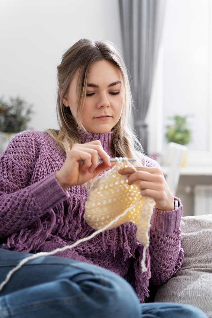 На расстоянии 65,5 сантиметров, что соответствует 36 рядов от нижней планки, с обеих сторон необходимо оставить по 11 (11) 14 петель для плечевых скосов, не производя вязки. Вместе с началом формирования скосов следует оставить не связанными центральные 20 петель, которые будут формировать край горловины, и закончить вязание обеих сторон раздельно.